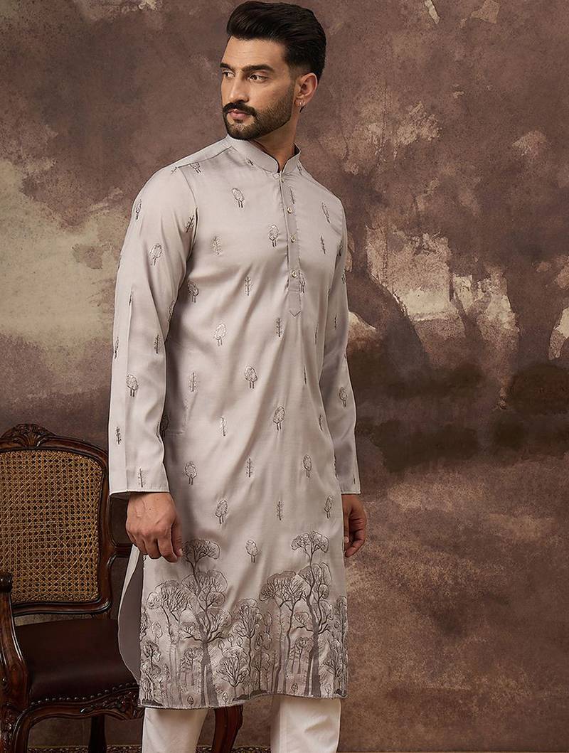 Men Grey Silk Blend Solid Embroidered Straight Kurta And Trouser