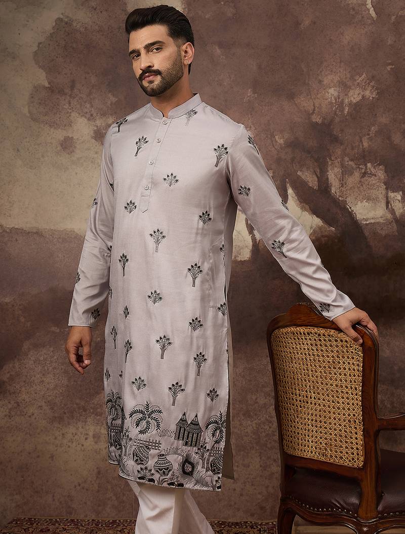 Men Grey Silk Blend Solid Embroidered Straight Kurta
