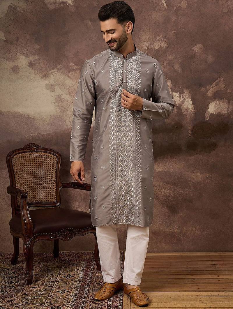 Men Grey Silk Blend Solid Embroidered Straight Kurta With Pant Set