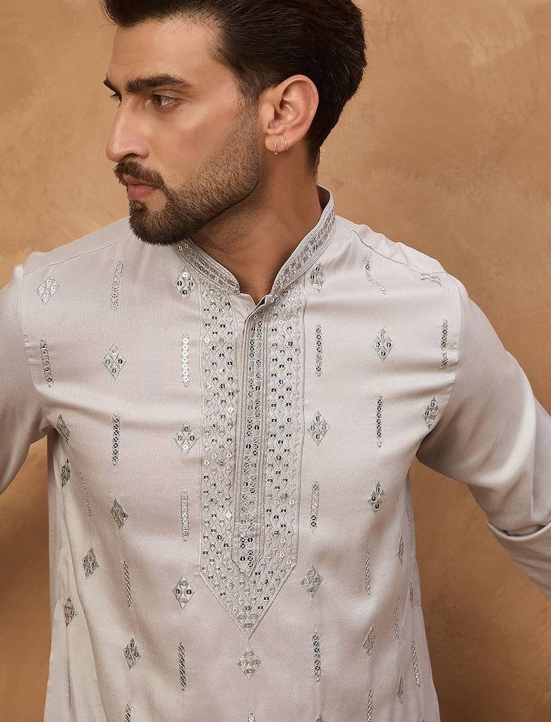 • Product Id : 4728164 • Package Details : 1 Kurta / 1 Trouser • Type : Kurta Pajama • Region : India • Fabric : Silk • Work : Embroidered • Look : Traditional • Bottom Style : Trouser • Sleeve : Full Sleeve • Neck Style : Band Collar Neck Kameez • Color : Grey • Top Color : Grey • Top Fabric : Silk • Stitching : Stitched Payments [+]