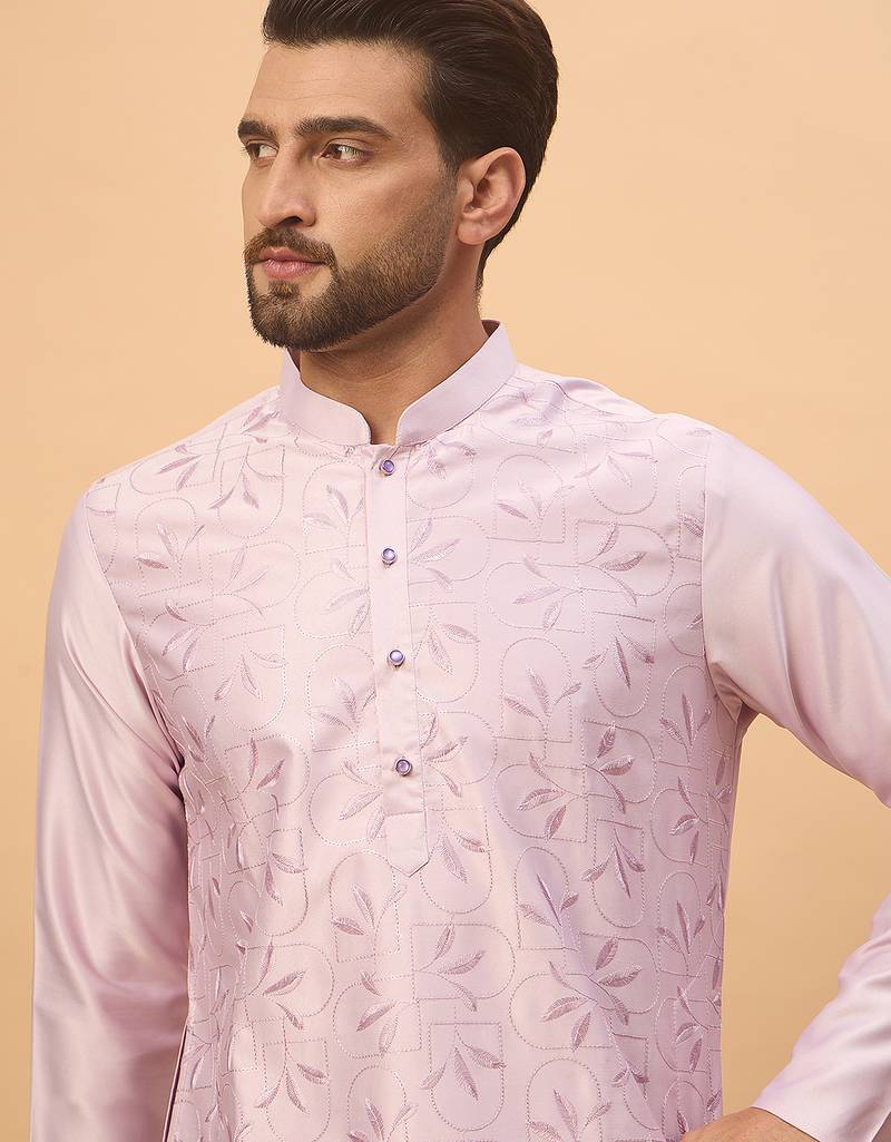 Men Lavender Silk Blend Solid Embroidered Straight Kurta