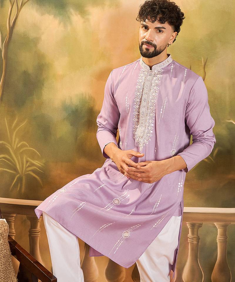 Men Lavender Silk Blend Solid Embroidered Straight Kurta With Trouser