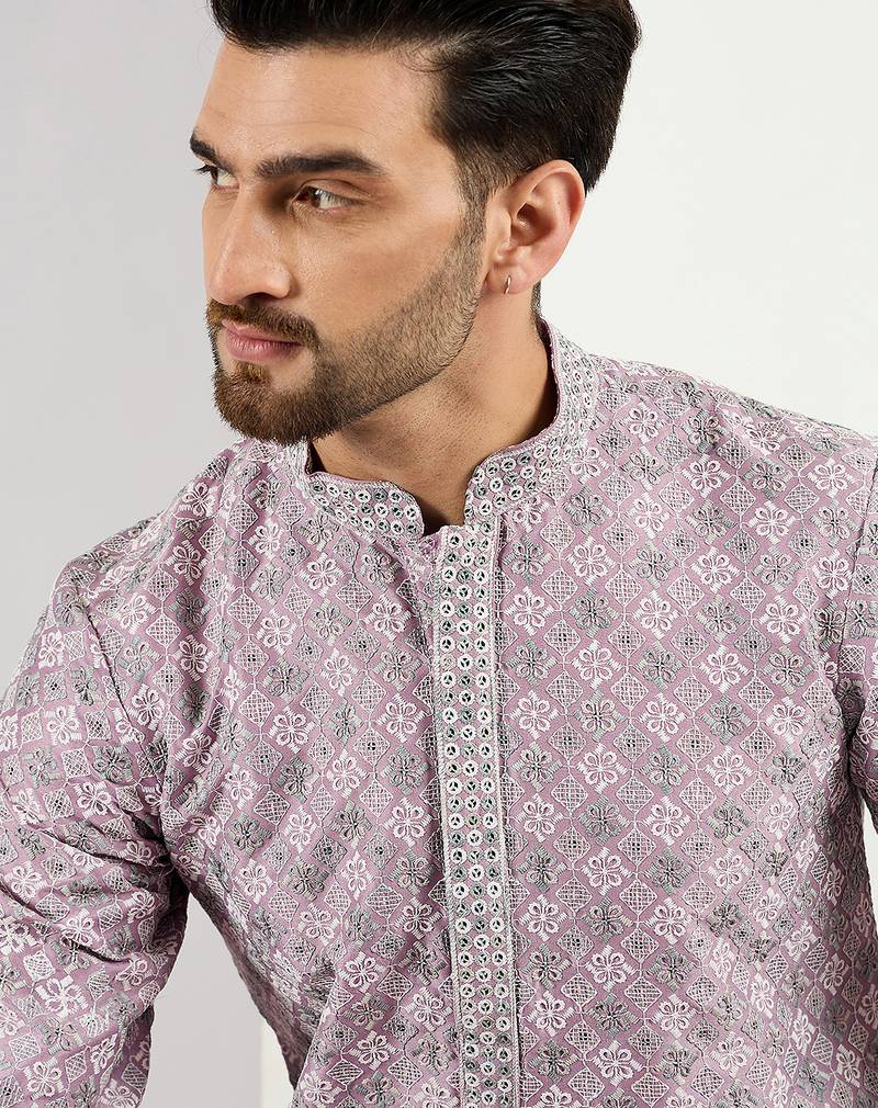 Men Lavender Viscose Rayon Solid Embroidered Chikankari Straight Kurta