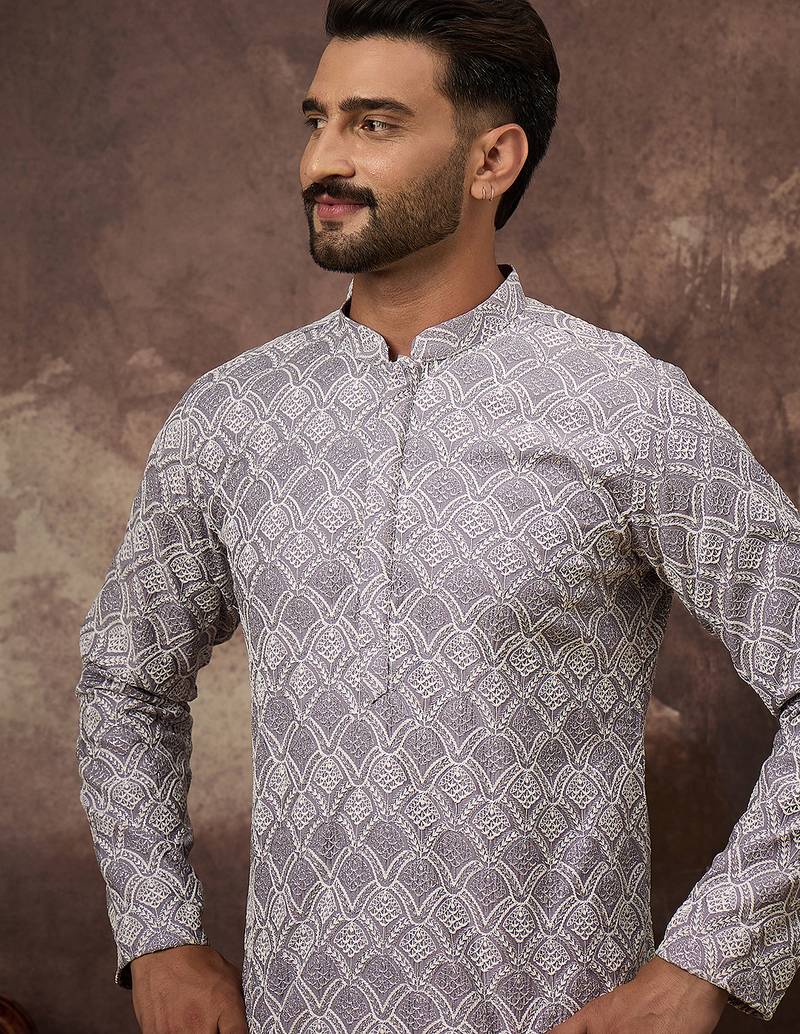 Men Lavender Viscose Rayon Solid Embroidered Straight Kurta