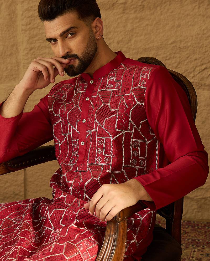 Men Maroon Silk Blend Solid Embroidered Straight Kurta With Trouser