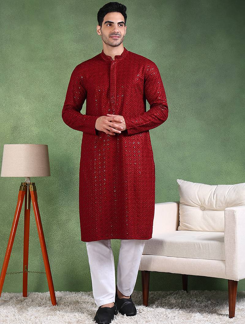 Men Maroon Viscose Rayon Solid Embroidered Straight Kurta