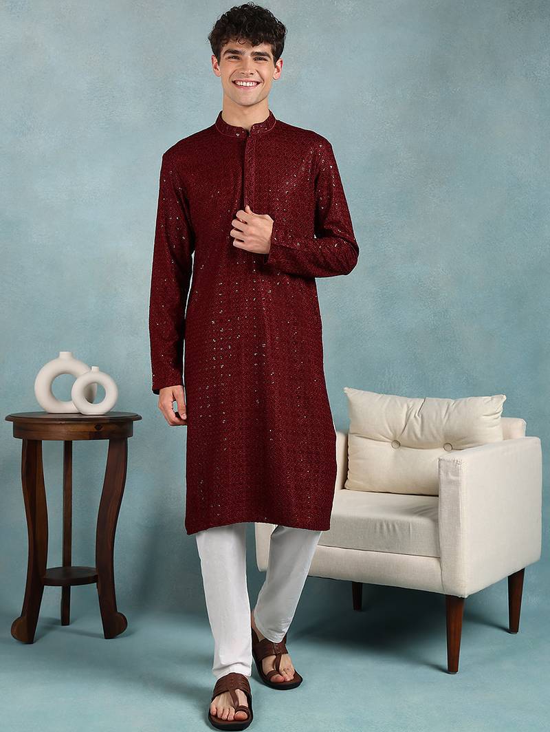 Men Maroon Viscose Rayon Solid Embroidered Straight Kurta