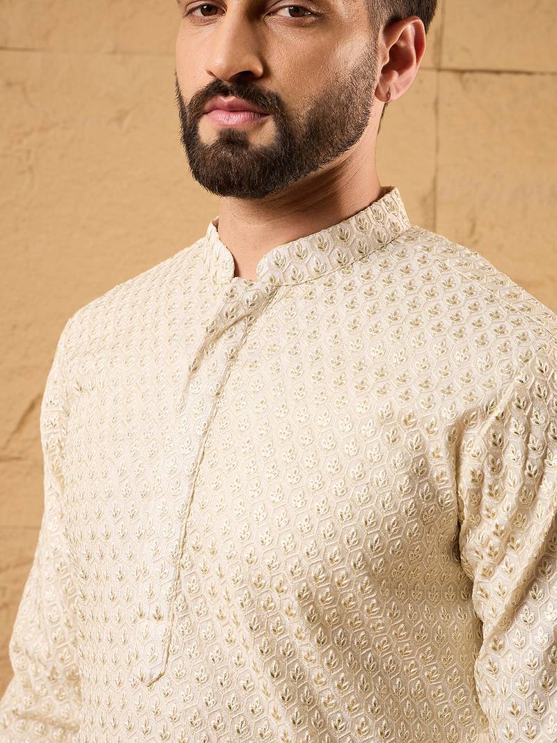 Men Off White Silk Blend Solid Embroidered Straight Kurta