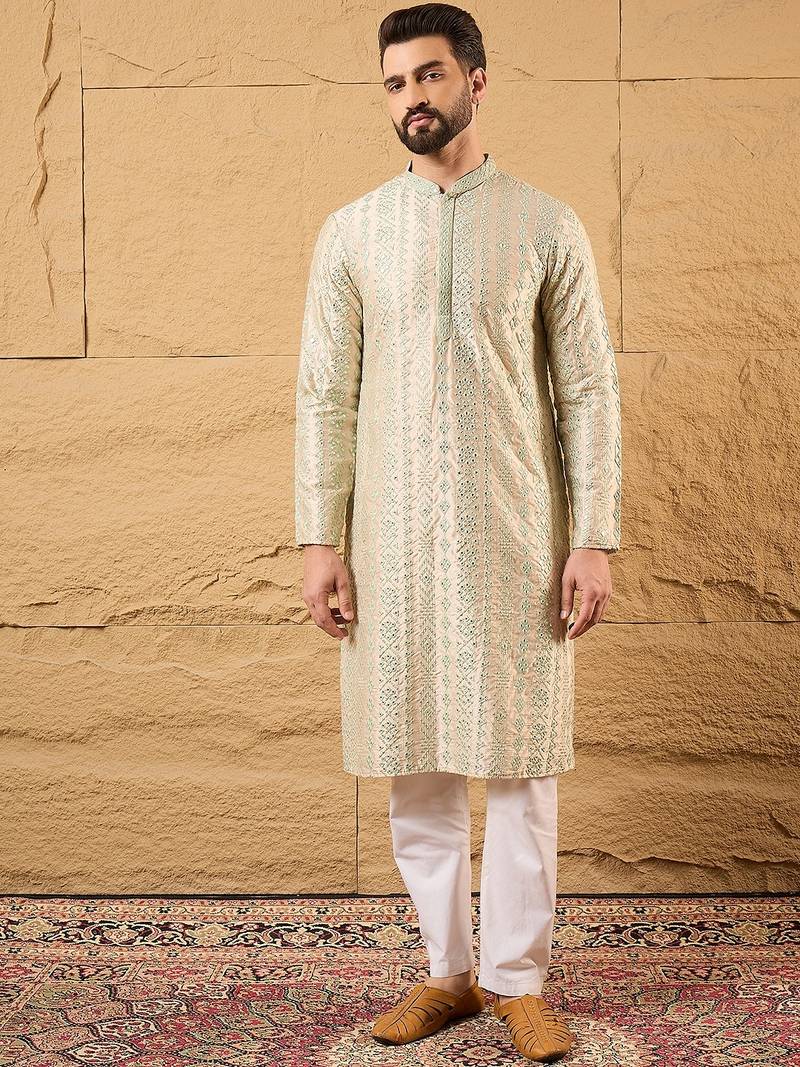 Men Off White Silk Blend Solid Embroidered Straight Kurta With Trouser