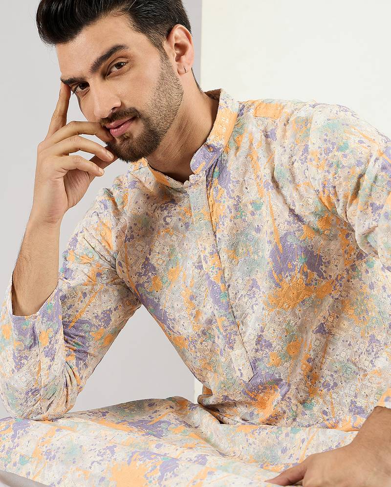 Men Off White Viscose Rayon Abstract Embroidered Chikankari Straight Kurta