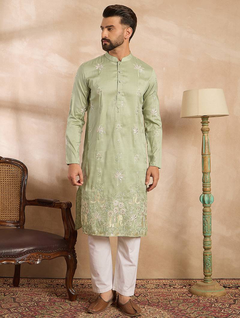 • Product Id : 4729098 • Package Details : 1 Kurta • Type : Kurta • Region : India • Work : Embroidered • Look : Traditional • Sleeve : Full Sleeve • Neck Style : Band Collar Neck Kameez • Color : Green • Top Color : Green • Top Fabric : Silk Blend • Fabric : Silk Blend • Stitching : Stitched Payments [+]