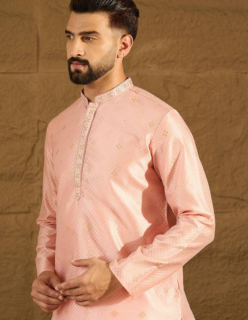 Men Peach Polyester Solid Embroidered Straight Kurta With Trouser
