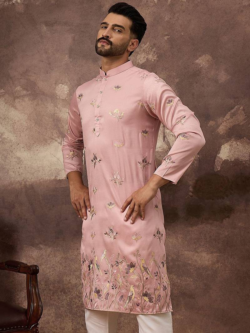 Men Peach Silk Blend Solid Embroidered Straight Kurta And Trouser