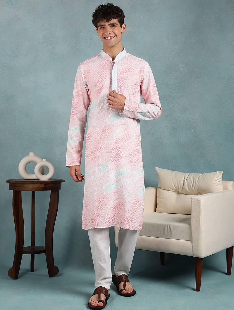 Men Peach Viscose Rayon Floral Embroidered Straight Kurta