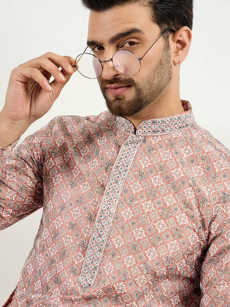 Men Peach Viscose Rayon Solid Embroidered Chikankari Straight Kurta