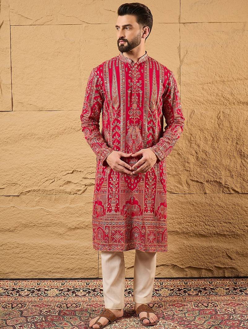 Men Pink Georgette Solid Embroidered Straight Kurta With Trouser