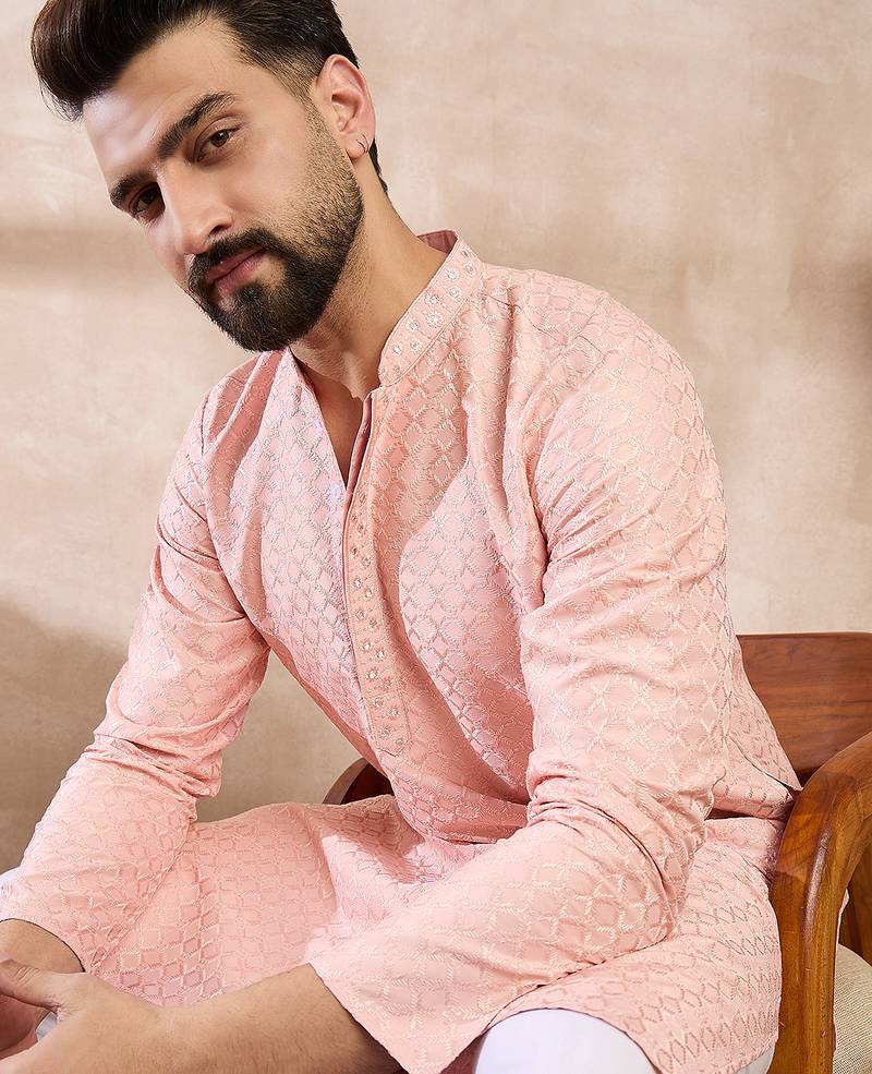 Men Pink Silk Blend Geometric Embroidered Straight Kurta