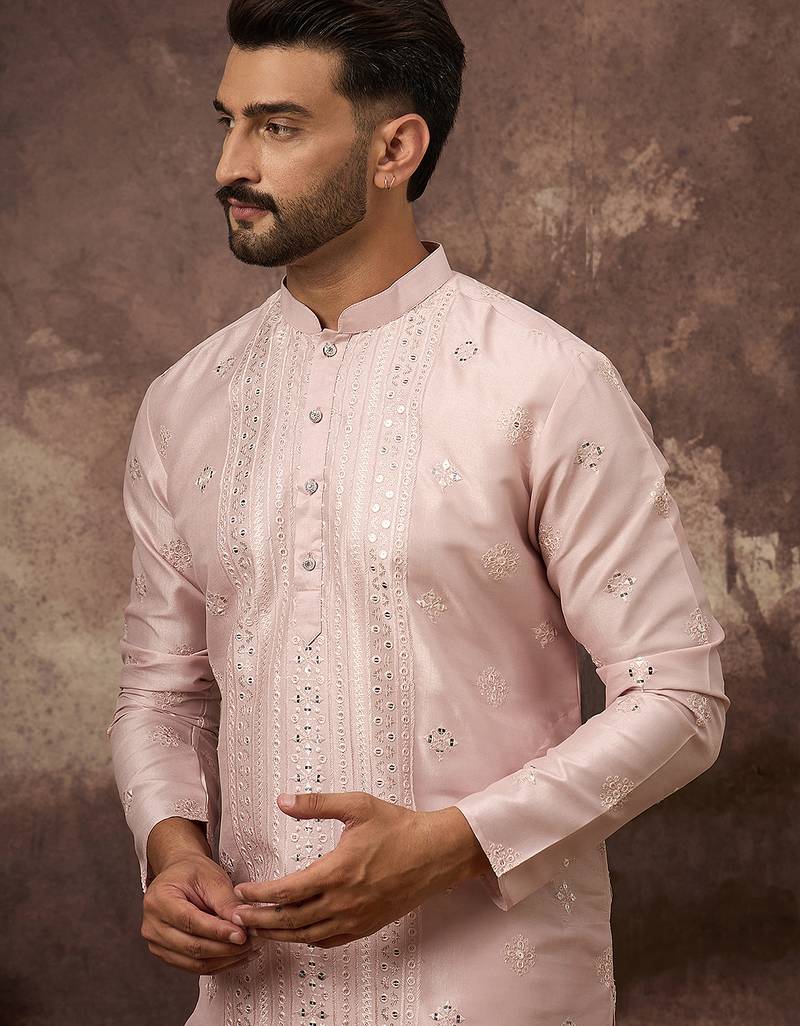 Men Pink Silk Blend Solid Embroidered Straight Kurta