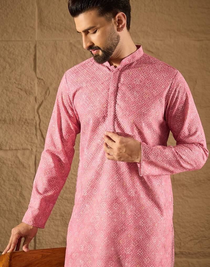 Men Pink Viscose Rayon Bandhani Embroidered Straight Kurta