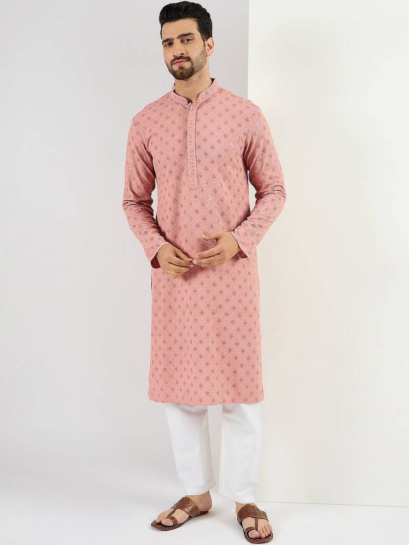 Men Pink Viscose Rayon Embroidered Straight Kurta With Pant Set