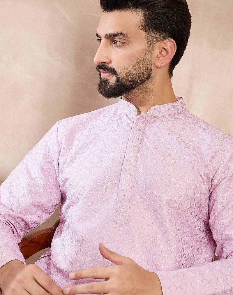 Men Purple Silk Blend Geometric Embroidered Straight Kurta