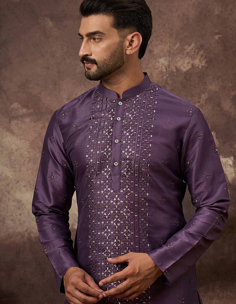 Men Purple Silk Blend Solid Embroidered Straight Kurta