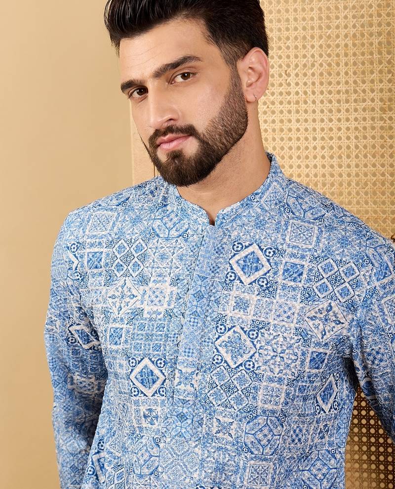 Men's Blue Viscose Rayon Geometric Embroidered Straight Chikankari Kurta