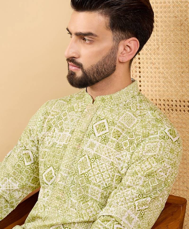 Men's Olive Viscose Rayon Geometric Embroidered Straight Chikankari Kurta