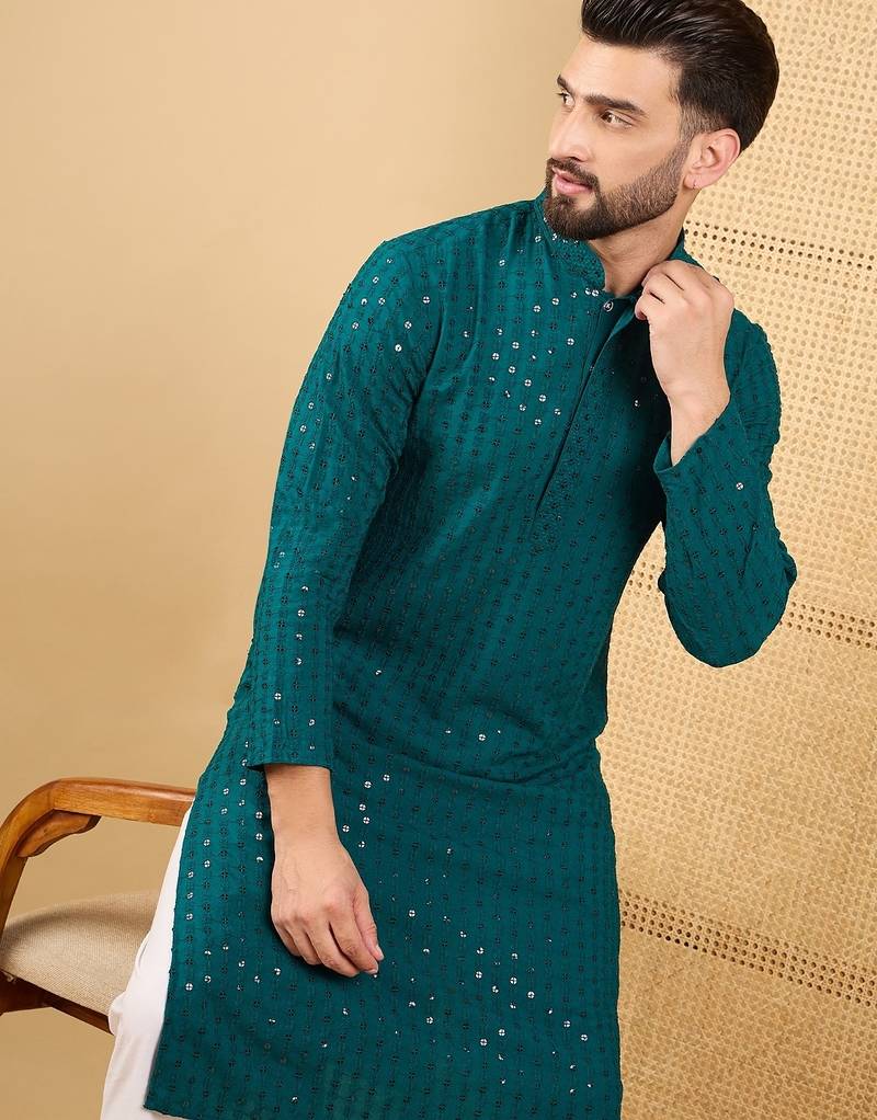 Men's Teal Viscose Rayon Solid Embroidered Straight Chikankari Kurta