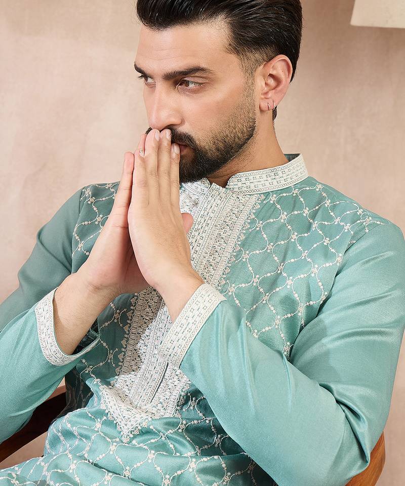 Men Teal Silk Blend Geometric Embroidered Straight Kurta