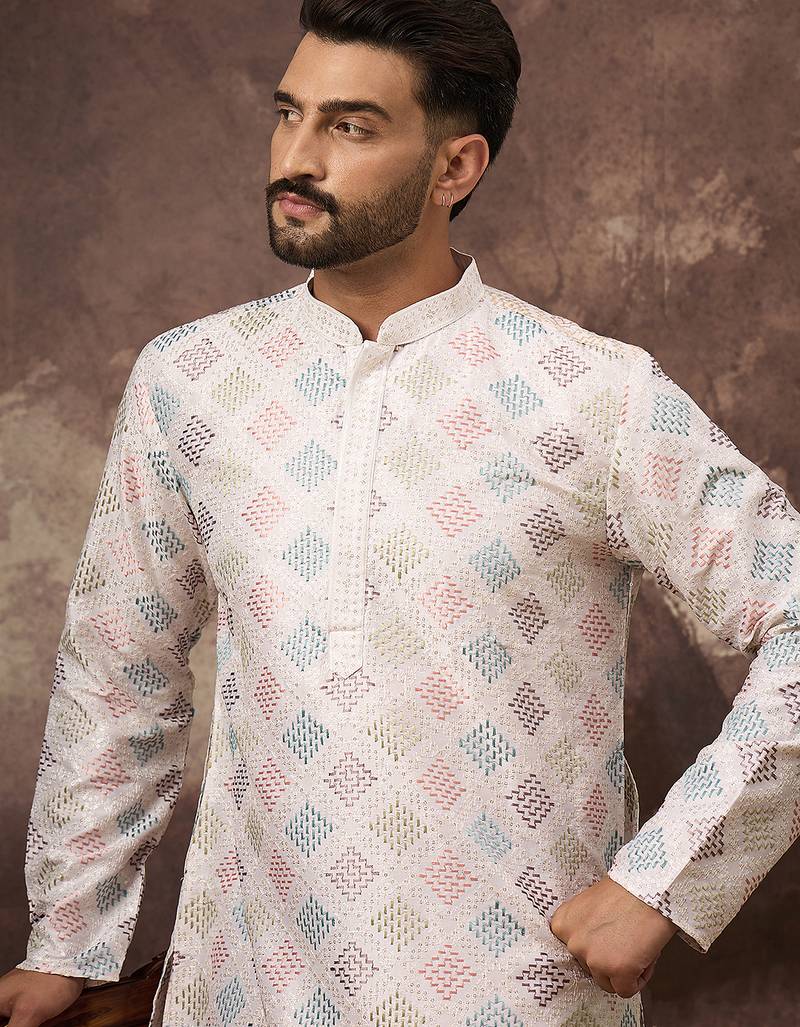 Men White Silk Blend Solid Embroidered Straight Kurta