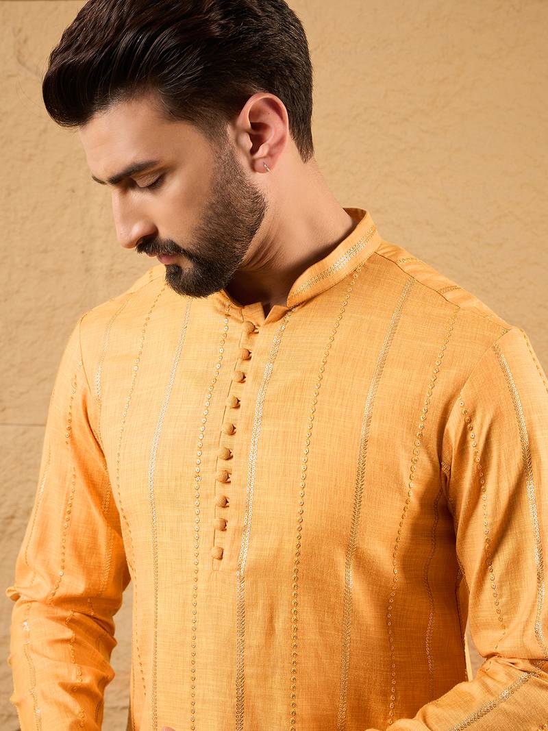 Men Yellow Cotton Solid Embroidered Straight Kurta