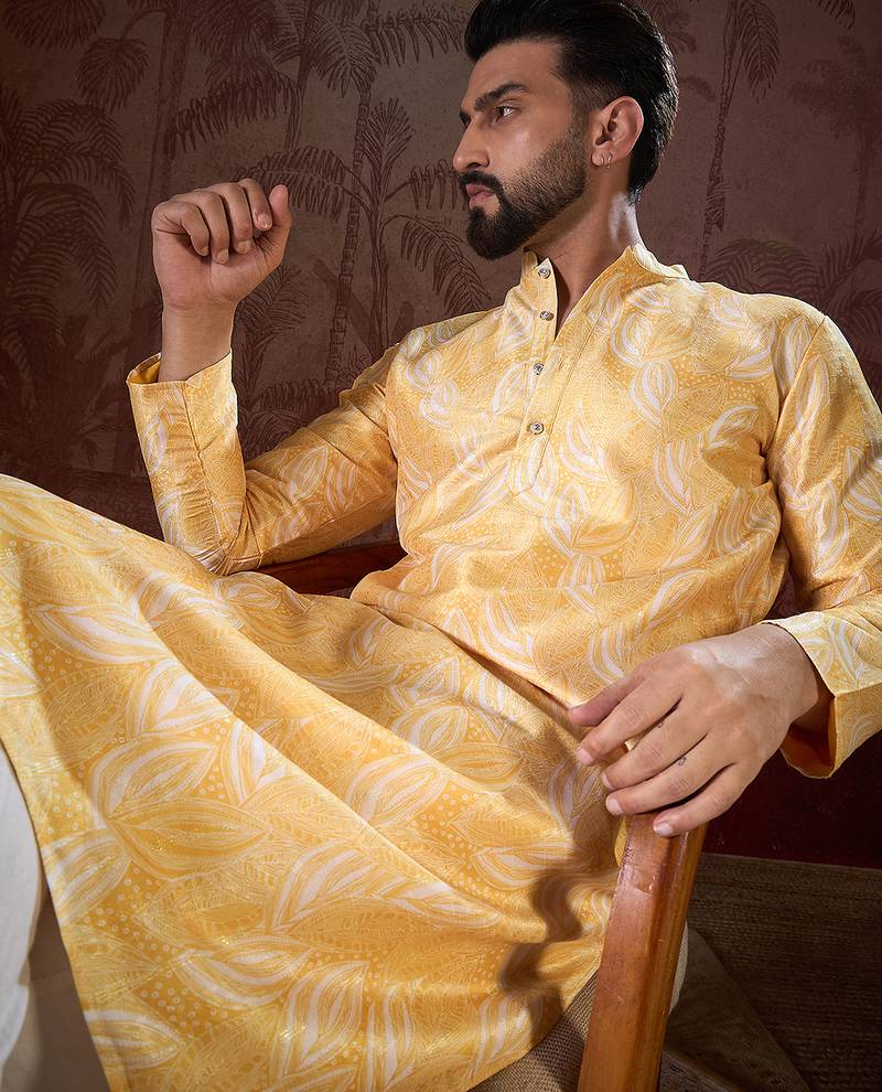 • Product Id : 4728427 • Package Details : 1 Kurta / 1 Trouser • Type : Kurta Pajama • Region : India • Work : Printed • Look : Traditional • Bottom Style : Trouser • Sleeve : Full Sleeve • Neck Style : Band Collar Neck Kameez • Color : Yellow • Top Color : Yellow • Top Fabric : Silk Blend • Fabric : Silk Blend • Stitching : Stitched Payments [+]