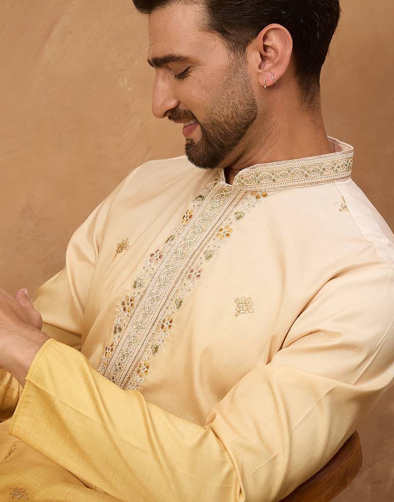Men Yellow Silk Blend Solid Embroidered Straight Kurta