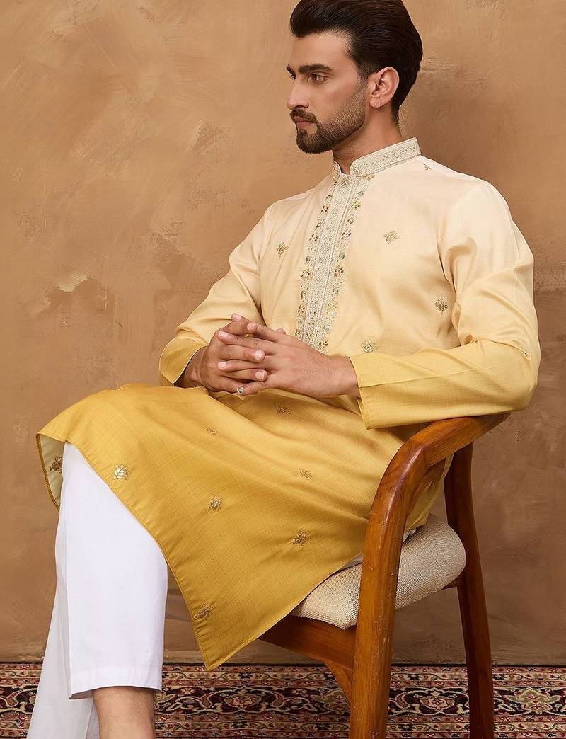 • Product Id : 4728201 • Package Details : 1 Kurta / 1 Trouser • Type : Kurta Pajama • Region : India • Fabric : Silk • Work : Embroidered • Look : Traditional • Bottom Style : Trouser • Sleeve : Full Sleeve • Neck Style : Band Collar Neck Kameez • Color : Yellow • Top Color : Yellow • Top Fabric : Silk • Stitching : Stitched Payments [+]