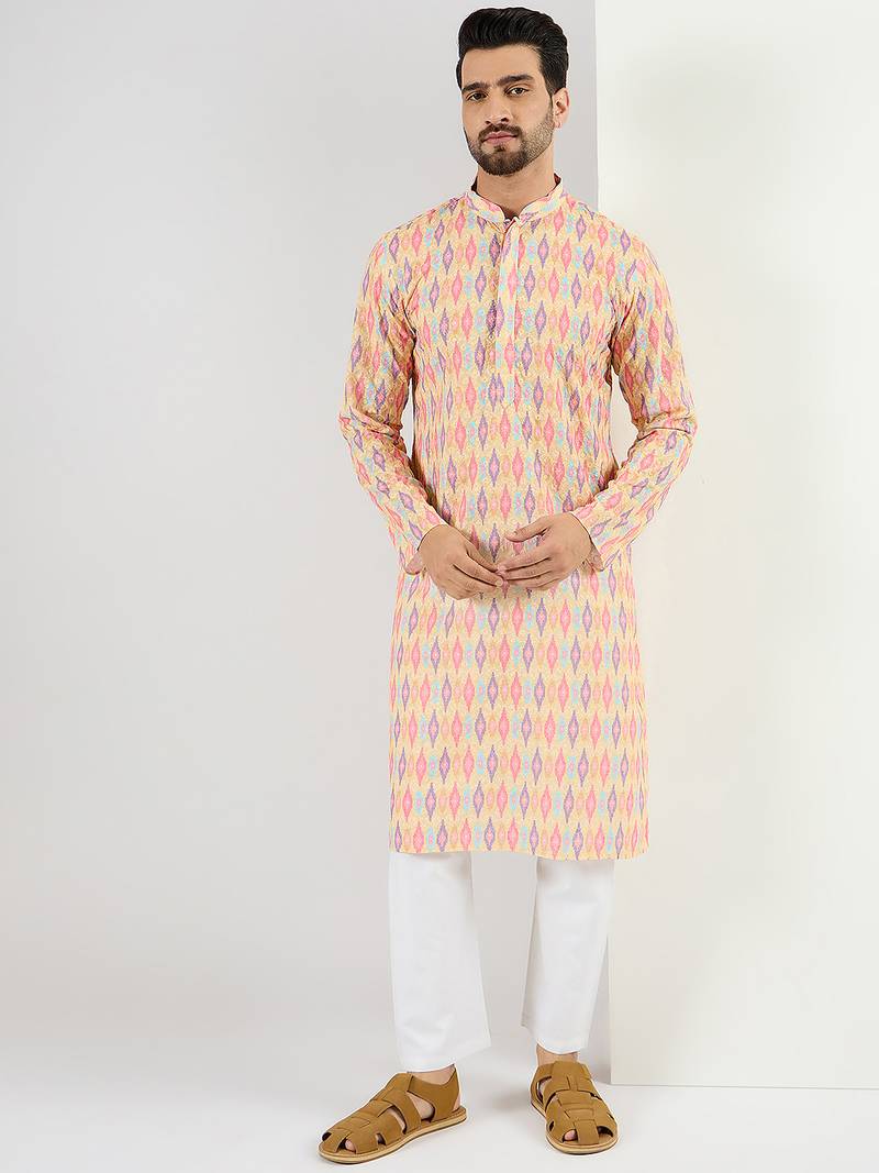 Men Yellow Viscose Rayon Abstract Embroidered Chikankari Straight Kurta