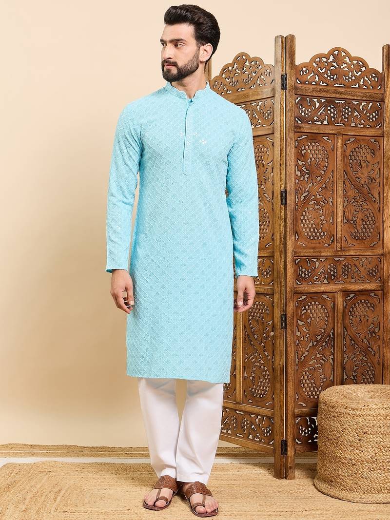 Mens Turquoise Blue Viscose Rayon Solid Embroidered Ethnic Straight Chikankari Kurta