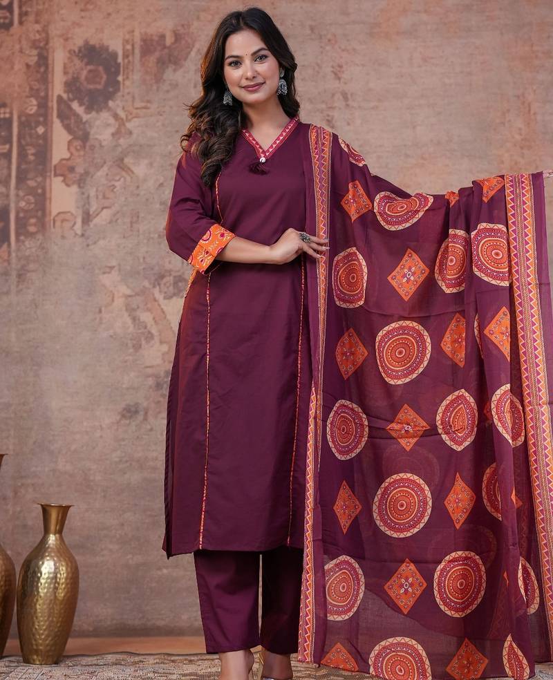 Premium Heavy Quality Cotton Cambric Printed A-Line Kurti. With Beautiful Embroidery and Lace work and (Both side Pocket with Embroidery work)with Cotton Dyed Pant and Full size Cotton Mulmul Printed Dupatta