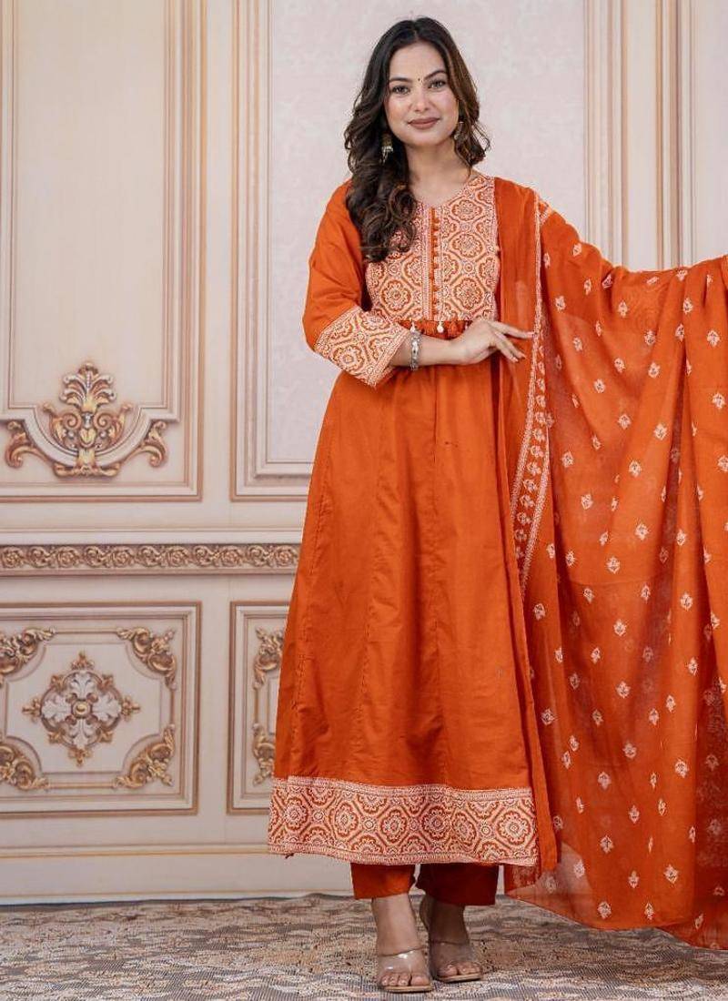Premium Quality Cotton Cambric Beautiful Printed Anarkali kurti with Beautiful Hand and Tussle work ..with Cotton Dyed Pant and Full size Beautiful Cotton Printed Dupatta