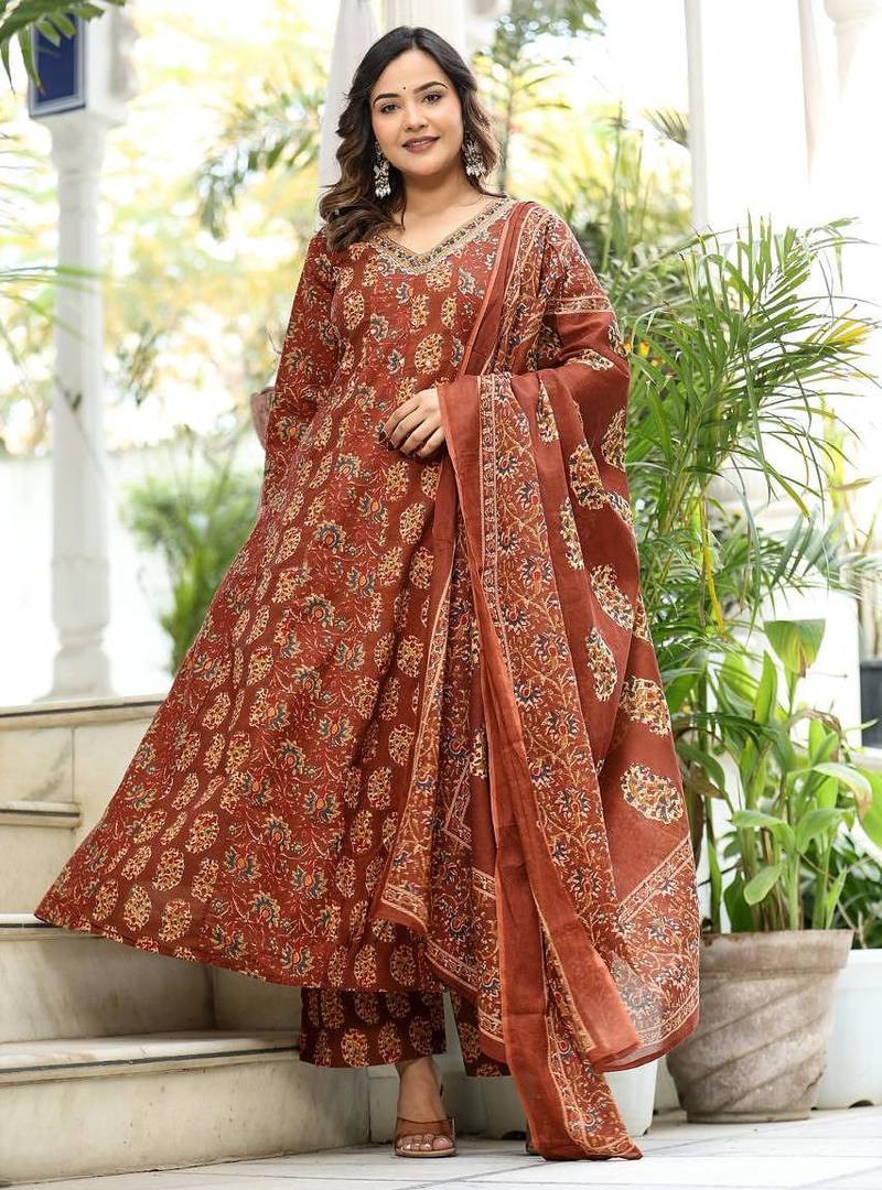 Premium Heavy Quality Cotton Cambric Printed Full Flared Anarkali Kurti. With Beautiful Hand work with Cotton Printed Palazzo Pant and Full size Cotton Mulmul Printed Dupatta…