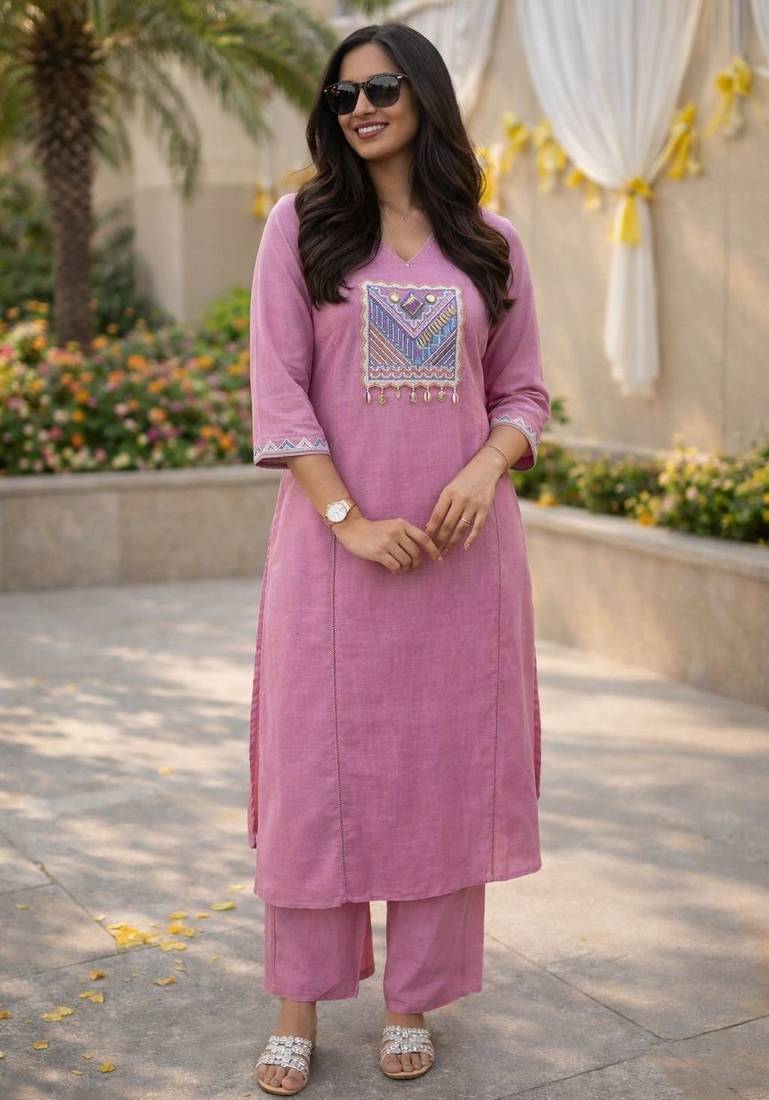 Premium Quality Cotton Slub Dyed Straight kurti with Beautiful Embroidery Mirror and Kodi work ..with Cotton Dyed Pant….