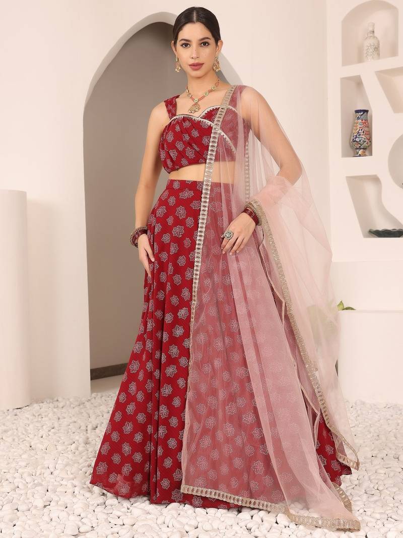 Ready To Wear Maroon Foil Printed Strap Neck Style Lehenga Set