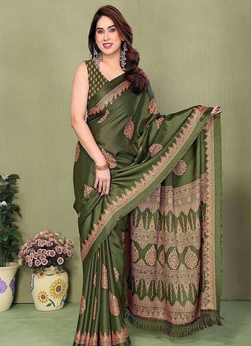 FABMORA Elevate your ethnic wardrobe with this stunning silk saree, a perfect blend of tradition and elegance. Crafted from luxurious silk, it features intricate zari work that adds a touch of opulence to any occasion. The rich green hue is not only eye-catching but also versatile, making it ideal for weddings, festivals, or special gatherings. Drape yourself in this timeless piece and make a statement that reflects your unique style.