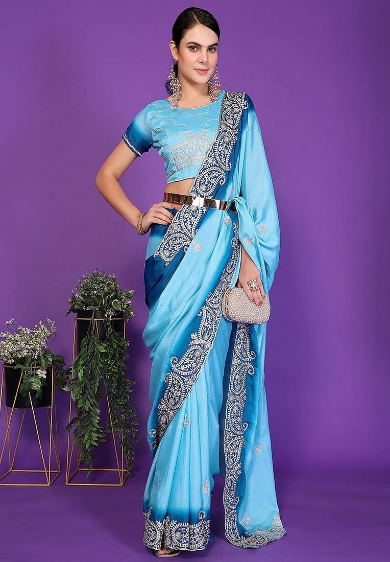 Blue Wedding Party & Festive Art Silk Embroidered Saree With Blouse