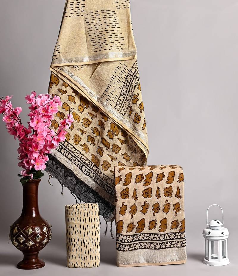 Beige Bagru Hand Block Printed Linen Suits With Zari Border Unstitched