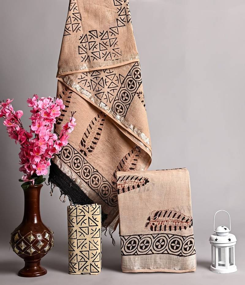 Beige Bagru Hand Block Printed Linen Suits With Zari Border Unstitched