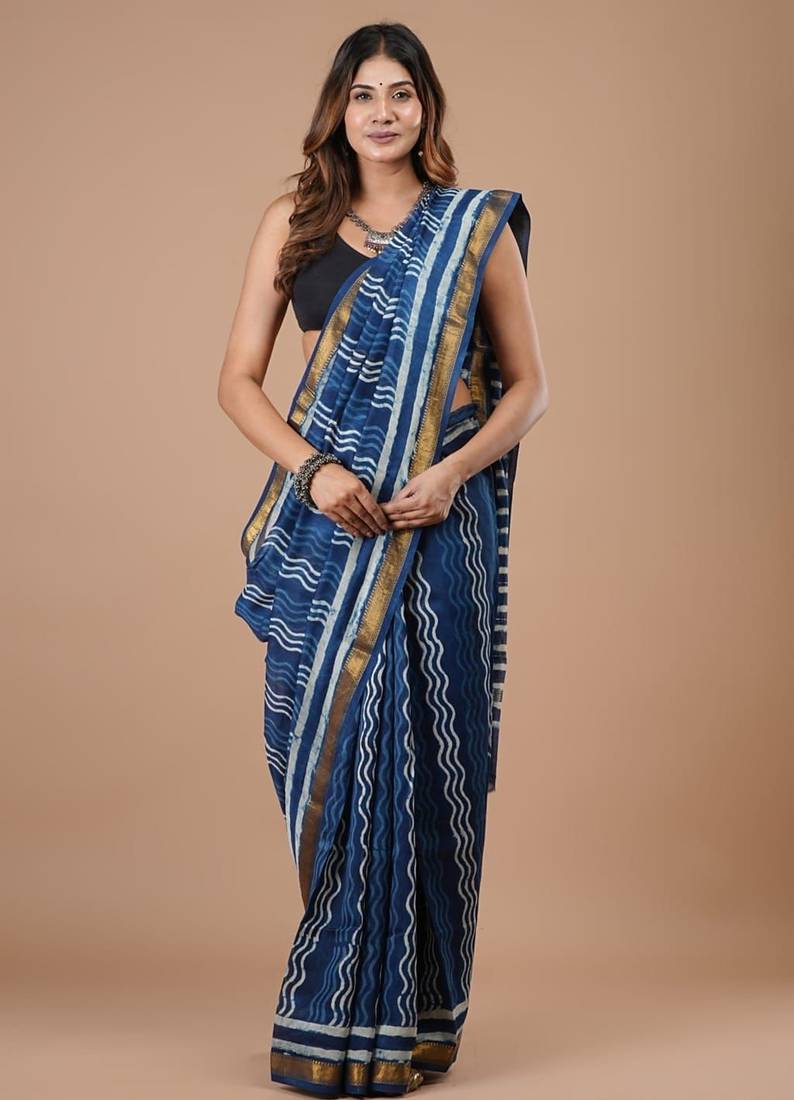 Blue Maheshwari Silk Saree With Woven Borders And Beautiful Hand Block Print