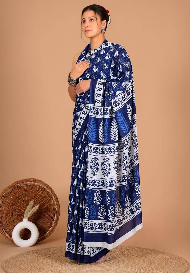 Blue Soft Mul Cotton Saree With Unstiched Attached Blouse Piece