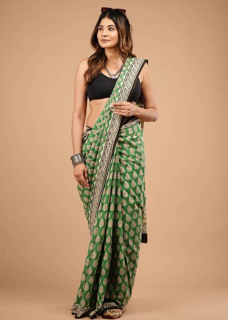 Green Cotton Hand Block Printed Mulmul Sarees With Attach Printed Blouse