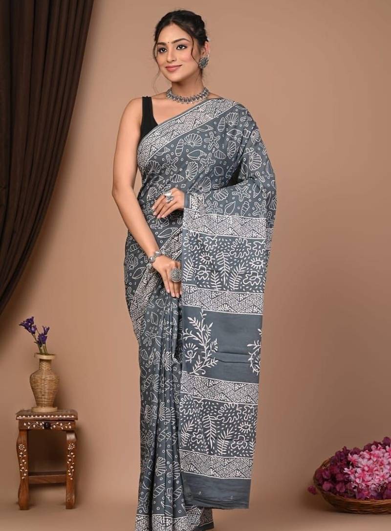 Grey Cotton Hand Block Printed Mulmul Sarees With Attach Printed Blouse